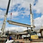 Nesta fase da obra, foi iniciada a montagem das vigas pré-moldadas do viaduto, estruturas fundamentais para a sustentação do equipamento viário, que serão apoiadas nas travessas e fundações já concluídas.